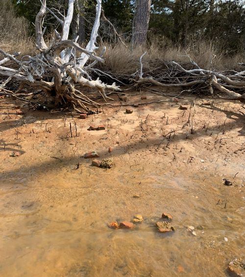 Le côté nord était divisé en petites et grandes touffes d'herbes marines et de souches d'arbres morts. Il était clair que les marées et les vents d'ouest avaient poussé l'eau salée plus haut dans le marais, tuant les derniers arbres du littoral sur cette partie. Après une marche difficile dans des zones boueuses et le franchissement de quelques mottes inégales, nous sommes arrivés à une petite étendue intacte de rivage sablonneux. C'est là que la chance a tourné. La première chose que j'ai vue, c'est un éparpillement de petits fragments de briques friables. Pas de briques complètes ni même de gros morceaux, mais des amas d'argile rouge tendre et peu cuite. Il s'agit manifestement de briques qui se sont dissoutes et qui ont été battues par les vagues au fil du temps. Outre les morceaux de briques, j'ai vu quelques fragments de poterie utilitaire. La poterie est l'un des outils les plus utiles à l'archéologue pour dater un site - du moins une période générale - mais elle peut parfois relier un site à une période très courte. Certains types de poterie sont de courte durée, souvent en raison de l'évolution des tendances, tandis que d'autres durent plus longtemps en raison de leur conception utile et de leur faible coût. Les trouvailles comprennent divers types de céramiques à corps rouge avec une glaçure noire ou brunâtre. Il s'agit de types de briques courantes qui ont une longue durée de vie, tout au long des périodes coloniale et postcoloniale. Heureusement, il y avait aussi quelques fragments du North Devon, taillés dans le gravier et non taillés dans le gravier. Il y avait également quelques fragments de Buckley-ware. Il s'agit clairement d'objets que l'on aurait trouvés dans la plupart des foyers coloniaux de l'époque. Ils ont connu une période d'utilisation relativement solide qui s'est étendue sur le site 17e siècle, puis leur utilisation a diminué au cours du site 18e siècle, jusqu'à ce qu'ils disparaissent presque complètement des sites vers la fin du demi-siècle.