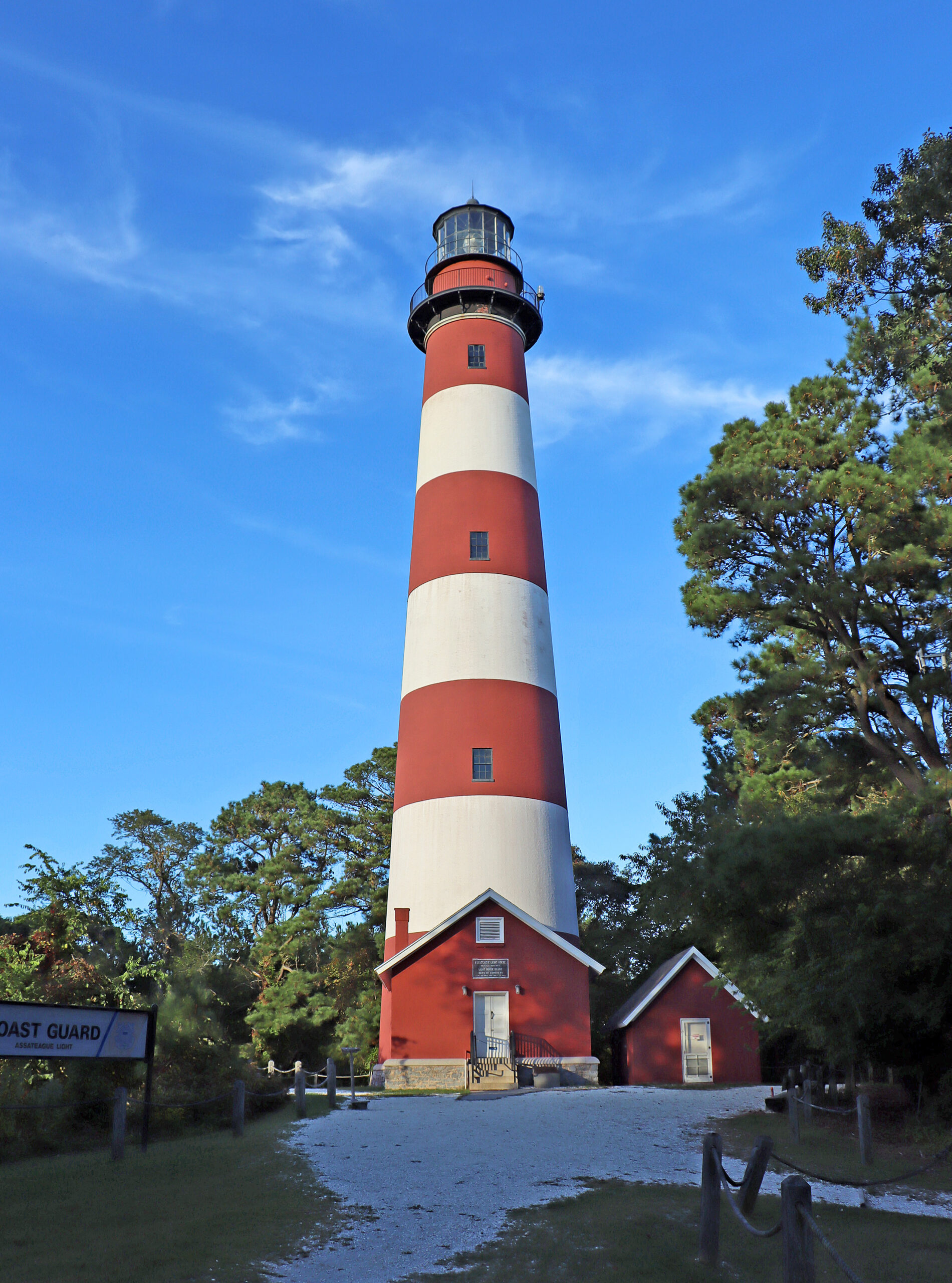 Peu de bâtiments méritent mieux que les phares le terme d'emblème. Ces structures singulières constituent des points de convergence visibles et nécessaires le long des côtes du pays. Le phare rouge et blanc d'Assateague, orné de bandes festives, sert de guide nautique pour l'extrémité sud de l'île d'Assateague, dans le comté d'Accomack, depuis qu'il a été allumé pour la première fois le 1er octobre 1, 1867, en remplacement d'une tour plus ancienne mais inadéquate, construite en 1831. Le phare, qui s'élève à 129 pieds de la base au phare, est construit en briques avec des murs effilés. Son mécanisme d'éclairage d'origine, une lentille de Fresnel importée de France, a été remplacé par un système automatique moderne. La lentille de Fresnel est aujourd'hui exposée au musée maritime et de l'huître de la ville de Chincoteague. Le phare d'Assateague est entretenu par les garde-côtes américains.