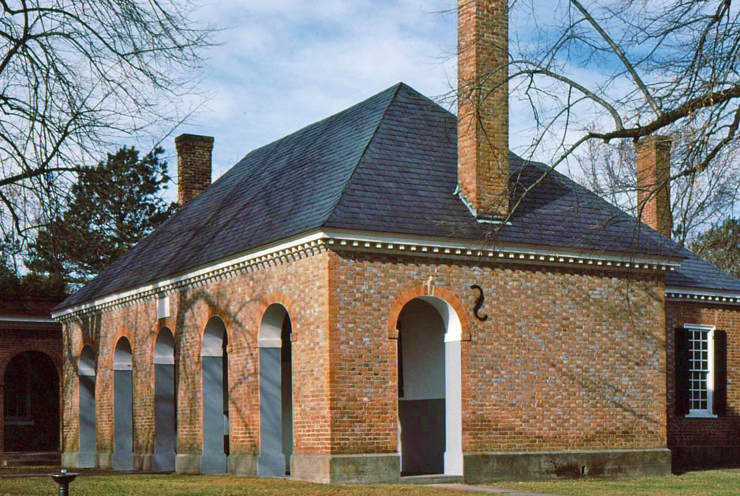 Le King William County Court House est le mieux conservé des onze palais de justice coloniaux de Virginie. Érigée dans le deuxième quart du 18e siècle, cette structure en forme de T est considérée comme le plus ancien palais de justice du pays encore en activité. L'arcade reliant les ailes du premier Capitole à Williamsburg constitue un précédent pour sa façade à arcades. Ces arcades étaient des lieux de rencontre publics traditionnels. La maçonnerie en briques flamandes avec des linteaux vitrés, des coins et des arcs en briques frottées confère un caractère supplémentaire à l'ensemble. L'enceinte du palais de justice est entourée d'un mur de briques datant du 19e siècle, construit pour empêcher le bétail d'y pénétrer. La plupart des premiers palais de justice coloniaux de Virginie étaient situés près du centre géographique de leur comté, sans lien avec une quelconque ville. Le palais de justice du comté de King William a suivi ce modèle et préserve toujours son cadre rural.