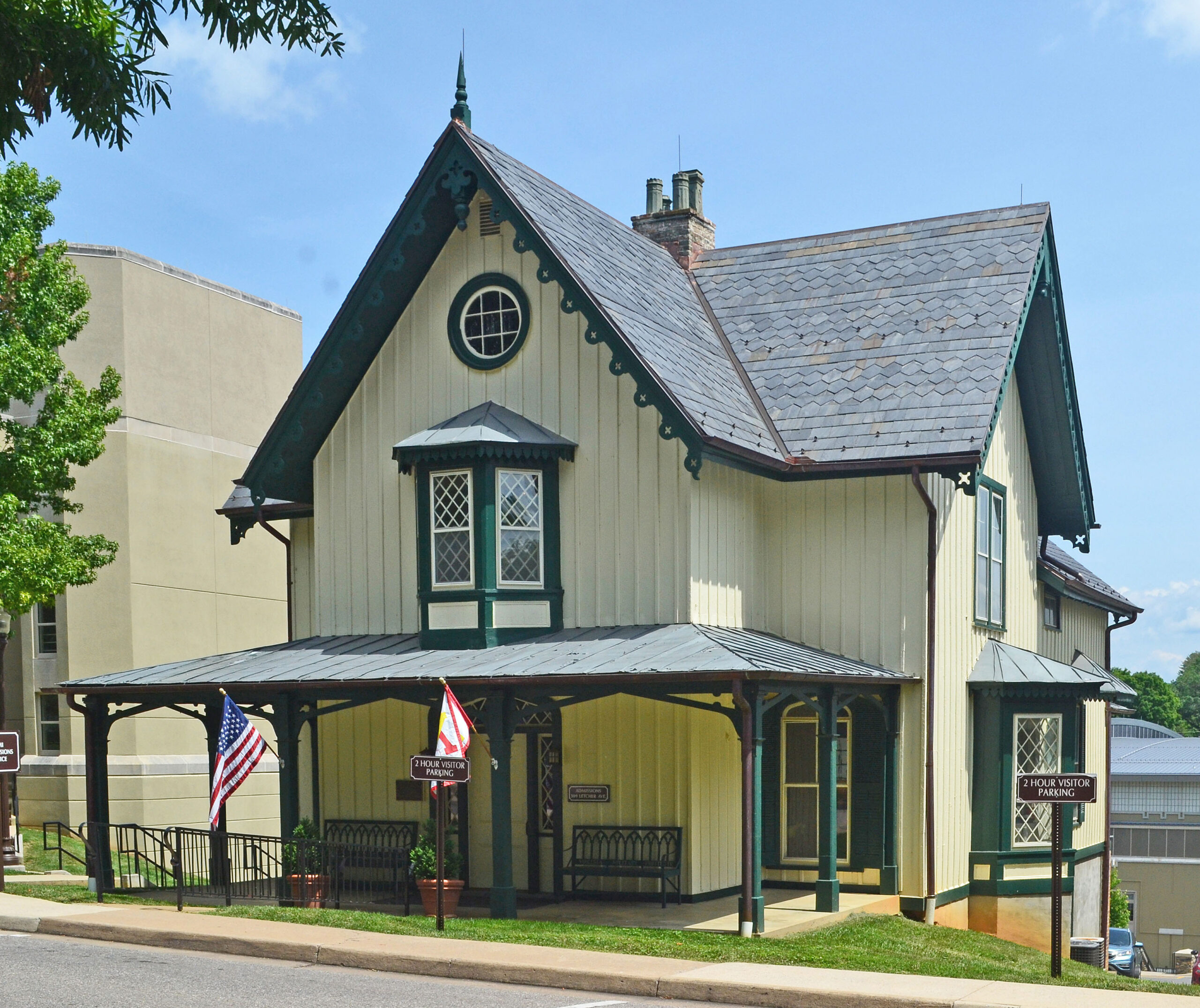 Créé en 1839, l'Institut militaire de Virginie est la première école militaire nationale soutenue par l'État. Il a fourni au pays de nombreux chefs militaires exceptionnels, dont le plus connu est le général d'armée George C. Marshall. Le campus, situé dans le quartier historique de Lexington, se compose de quelque vingt-cinq bâtiments principaux unis par un style néo-gothique crénelé. Le point central, The Barracks, est un complexe qui a beaucoup évolué et qui a été conçu à l'origine par Alexander Jackson Davis. Davis a également conçu des maisons de professeurs de style néo-gothique le long du Parade Ground, dont subsistent la Gilham House (1852) et le Superintendent's Quarters (1860). Dans les années 1910, l'architecte Bertram Grosvenor Goodhue a été chargé de construire le Jackson Memorial Hall et d'autres bâtiments pour les facultés. Le caractère gothique original établi par Davis a été soigneusement conservé dans ces œuvres et dans celles qui ont suivi. La variété du Virginia Military Institute Historic District est assurée par un certain nombre d'habitations du 19e siècle et des siècles suivants, dont la maison Pendleton-Coles, de style néo-gothique, où le général George C. Marshall s'est marié.