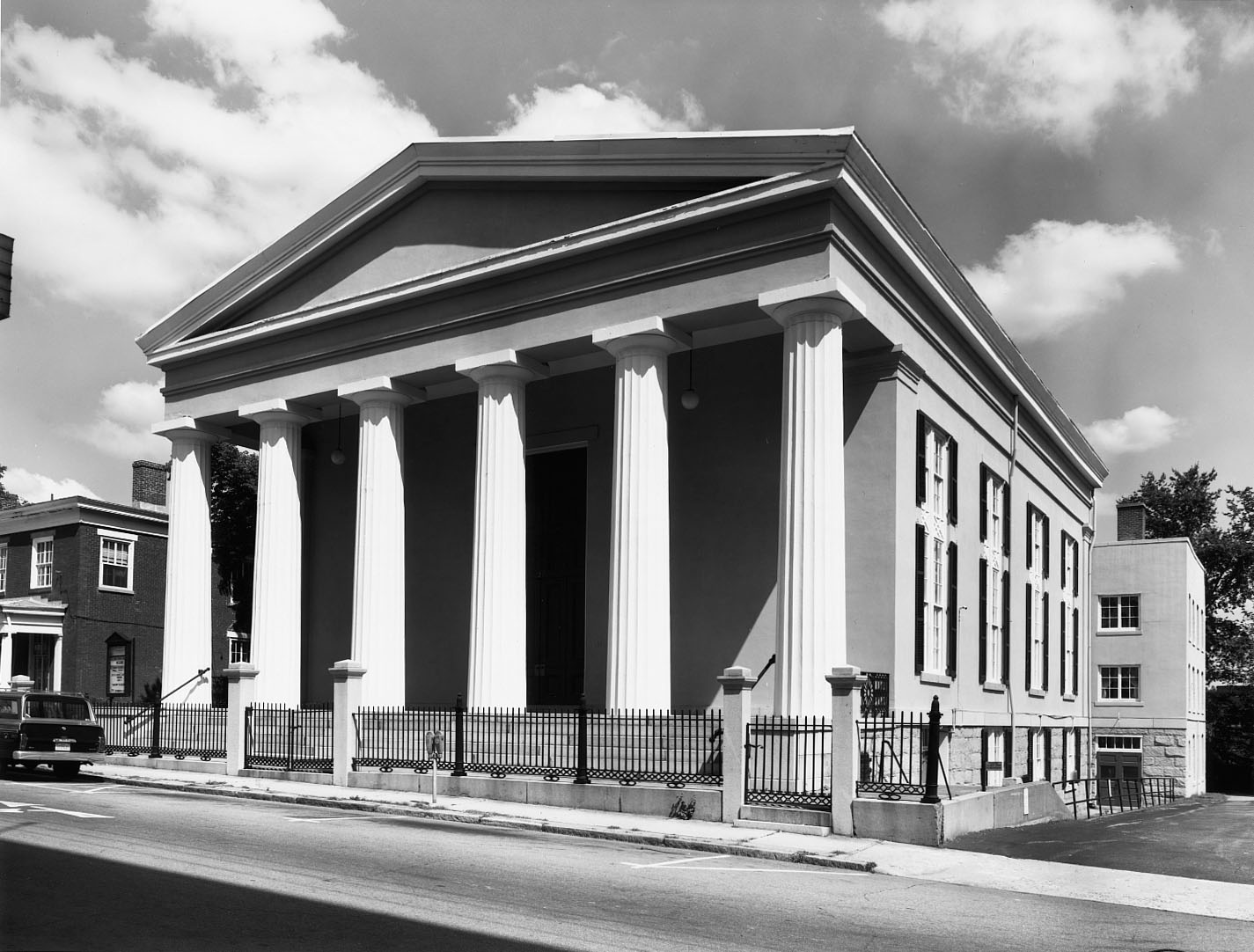 "L'architecte de Philadelphie Thomas U. Walter a donné à Virginia une interprétation puissante du mode grec avec son église presbytérienne de la rue Tabb ( 1843 ) dans la ville de Petersburg." Walter, dont on se souvient surtout qu'il a conçu le dôme du Capitole des États-Unis, était peut-être le plus habile à manier les ordres grecs, comme en témoignent le portique dorique de l'église et son abside intérieure. Le portique hexagonal s'inspire du Théséion, un ancien temple grec d'Athènes. L'abside est précédée d'une colonnade dans l'ordre de la Tour des Vents, librement adaptée, créant l'un des espaces les plus spectaculaires de ce type dans le pays. Le bâtiment a été construit par le maître d'œuvre Dabney Cosby, qui avait travaillé à l'université de Virginia. Le clocher carré d'origine, doté d'une flèche effilée, a été supprimé à l'adresse 1938. L'église actuelle est la troisième à desservir la congrégation depuis son organisation en 1813. L'église presbytérienne de Tabb Street est située dans le district historique du palais de justice de Petersburg.